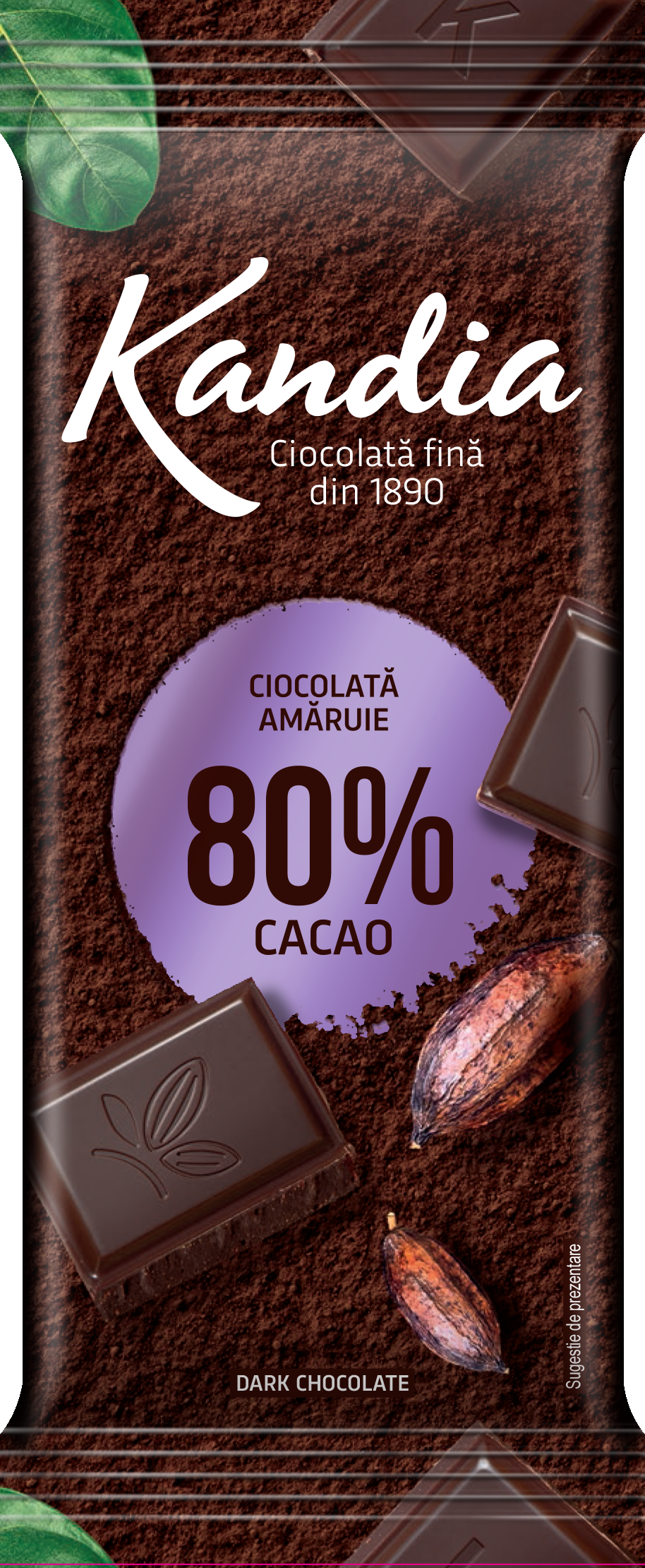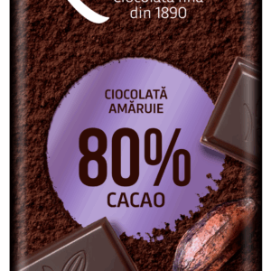 Složení: cukr, kakaová hmota, kakaové máslo, odtučněný kakaový prášek, rostlinné oleje (palmová a shea) sojový lecitin, ochucovač. Čokoláda obsahuje rostlinné tuky přidané ke kakaovému máslu. Čokoláda obsahuje min 80% pevného kakaa. Může obsahovat stopy arašidů, ořechů, mléka, lepku , vajec, kokosu.