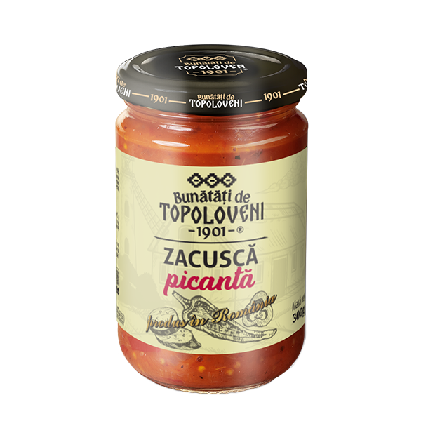 Když hledáte nejlepší recept na pikantní zacuscu, víte, že jste ho našli, když ochutnáte pikantní pochoutky zacusca z Topoloveni. Pálivá chuť je dána čerstvou feferonkou a je vyrobena tak, abyste měli jedinečný zážitek, kterého není ani málo, ani moc. Dáme do ní stejné ingredience jako doma, mnoho lilků pečených na plameni, asi 45 %, papriky, cibuli, mrkev, koření a vášeň, aby nakonec vzniklo to, čemu v Topoloveni říkají „čistá dobrota“. Jedinečnou chuť zacusce dodává plamen, a tak získá stejně lehce kouřově nasládlé aroma jako ta, která se připravuje v kotlíku.